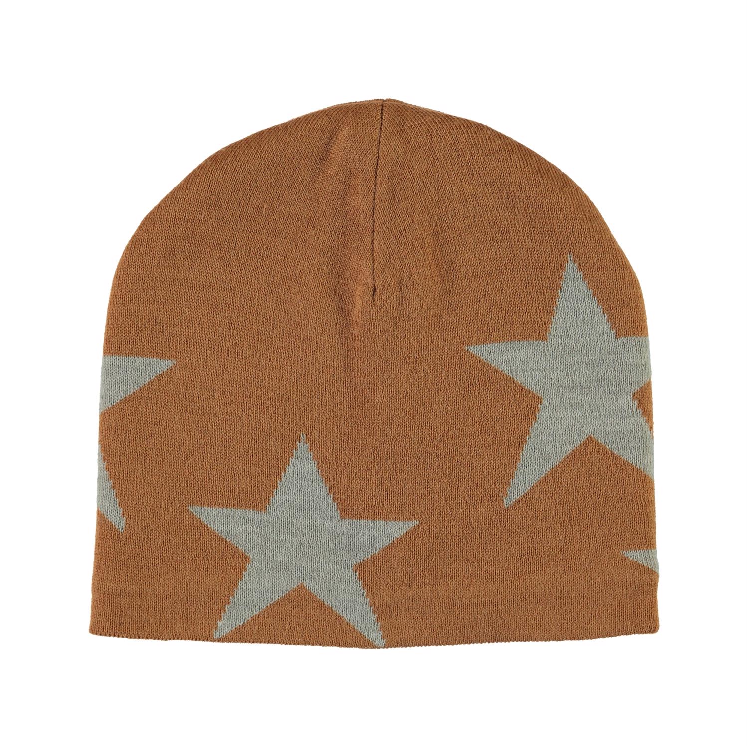 Goldene Mütze aus weichem Wollemix mit eingestrickten Sternen und Rippkante unten.
