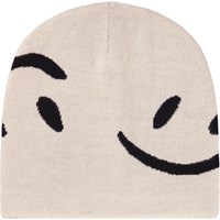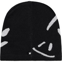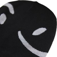 Schwarze gestrickte Mütze mit off-weißen lächelnden Gesichtern. Die Mütze ist aus einer weichen Wollmischung gefertigt.