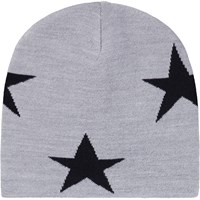 Graue Strickmütze mit schwarzen Sternen. Die Mütze ist aus einer weichen Wollmischung gefertigt.