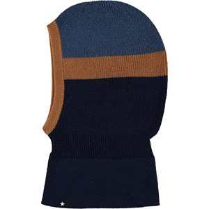 Zweifarbige blaue Sturmhaube in Strick mit brauner Kante rund ums Gesicht und Streifen.