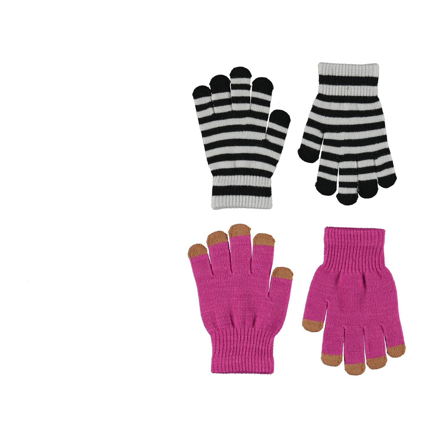 Zwei Paar Strickhandschuhe. Ein Paar ist in Pink mit braunen Fingerspitzen, während das andere Paar schwarz und grau gestreift ist.