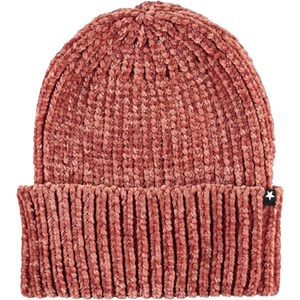 Rote, flauschige und weiche Mütze aus schönem Chenille-Strick mit großen Falten.