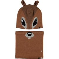 Schwarze Mütze und Halsrohr aus Wollmix mit einem Tigermotiv, das sowohl auf der Mütze als auch auf dem Halsrohr verteilt ist.