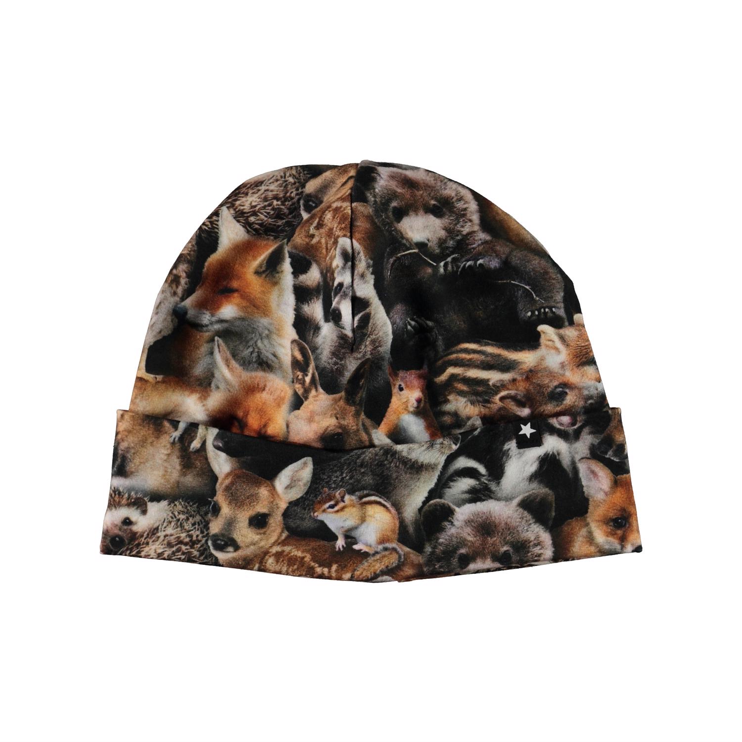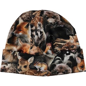 Weiche und elastische Doppelschichtmütze in Braun mit Aufdruck der Waldtiere. Die Mütze kann mit und ohne Umschlag verwendet werden.