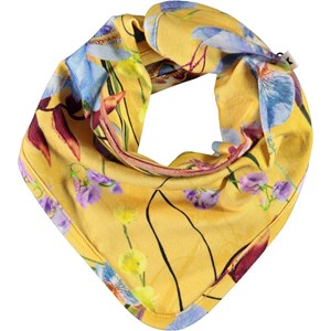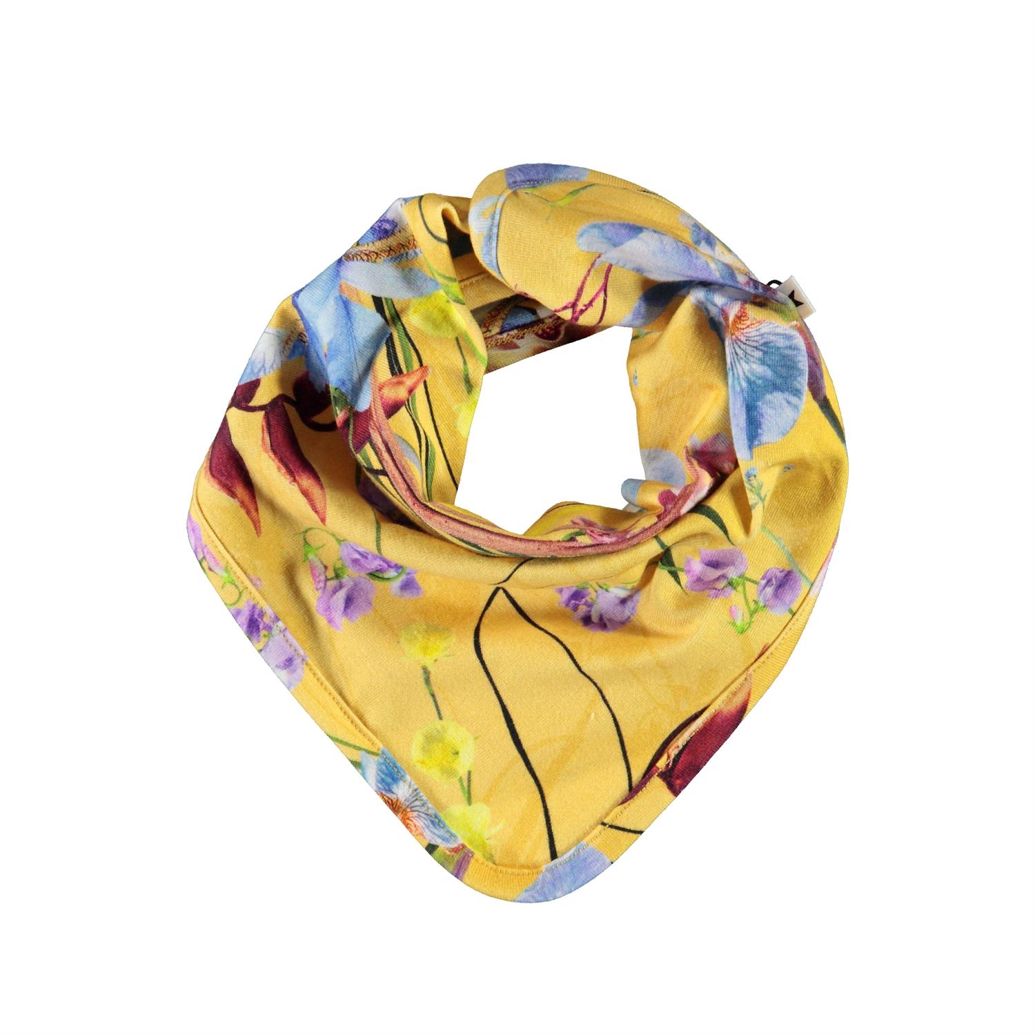Gelbes Lätzchen mit Blumen-Druck. Das Lätzchen wird mit einem Druckknopf im Nacken geschlossen.