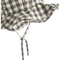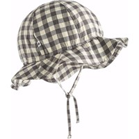 Schwarze und weiße karierte Babymütze mit Schirm und Bändern.