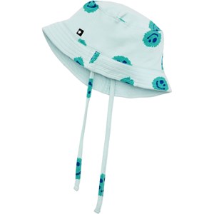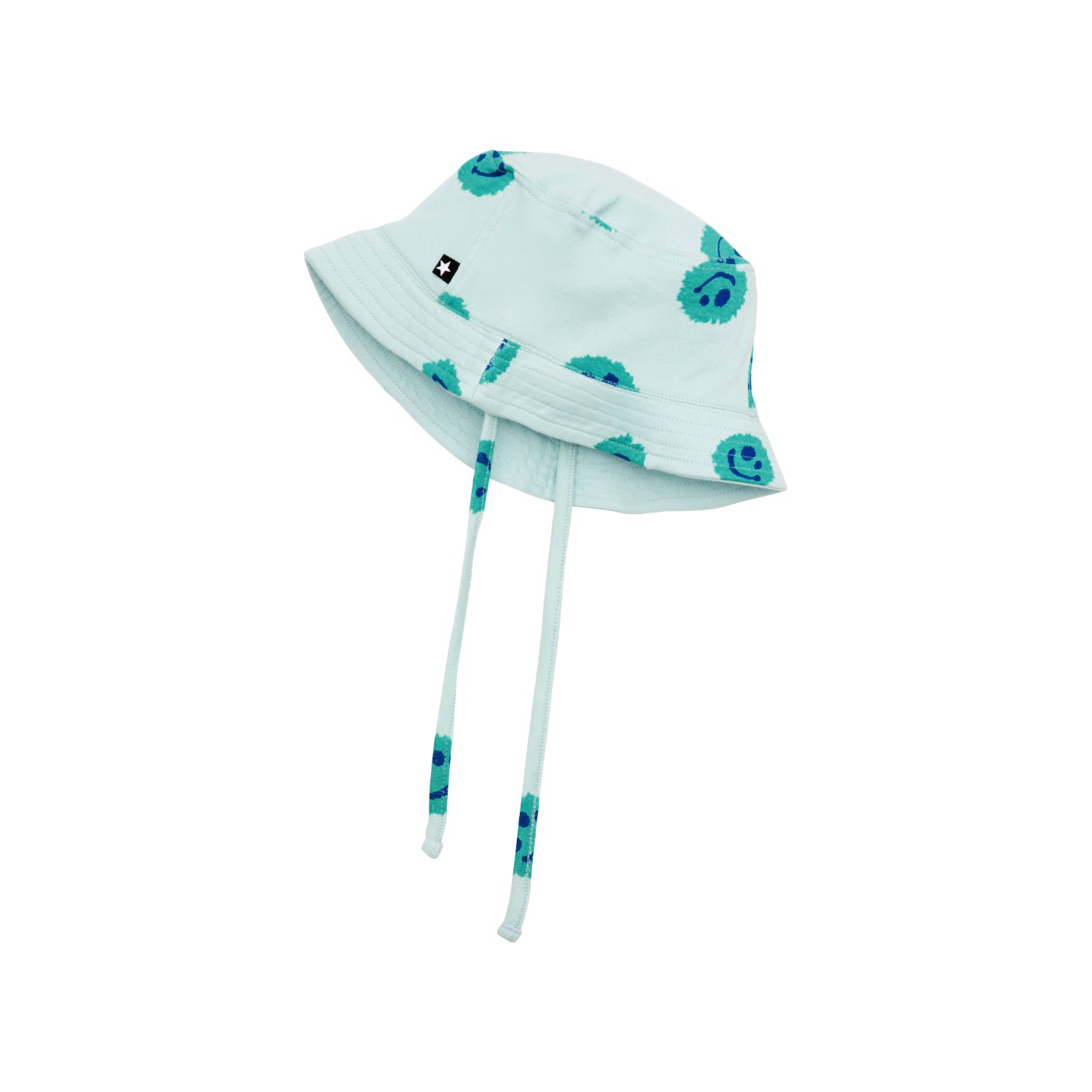 Hellblauer Sonnenhut aus weicher Öko-Baumwolle mit Bändern unter dem Kinn und einem Allover-Print aus türkisfarbenen Aquarellspritzern mit Smileys.