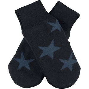 Gestrickte Fäustlinge in Blau mit gestrickten Sternen. Die Handschuhe bestehen aus einem weichen Wollmix.