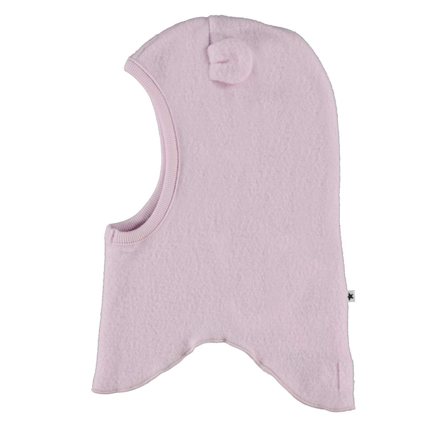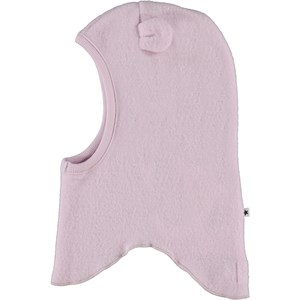 Lila Schlupfmütze in weicher Fleece-Qualität aus 100% Merinowolle. Die Mütze verfügt über eine runde, eng anliegende Öffnung für das Gesicht, niedliche aufgenähte Ohren und extra Länge im Nackenbereich vorne und hinten, um sicherzustellen, dass kalte Luft nicht eindringt.