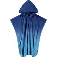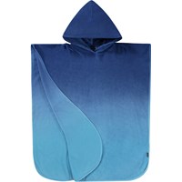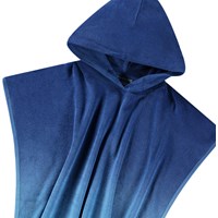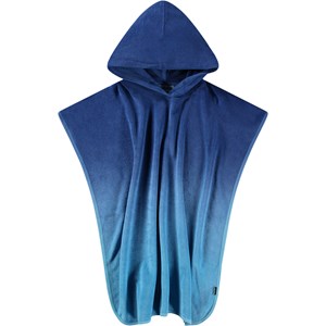 Blau schattierter Badeponcho aus weichem Baumwoll-Frottee. Der Poncho reicht bis zum Knie und ist an den Seiten offen, was einfache Bewegung ermöglicht. Er hat eine feste Kapuze mit einer großen Öffnung, die das An- und Ausziehen erleichtert. Der Frottee trocknet schnell und eignet sich für die Verwendung im Wasser.
