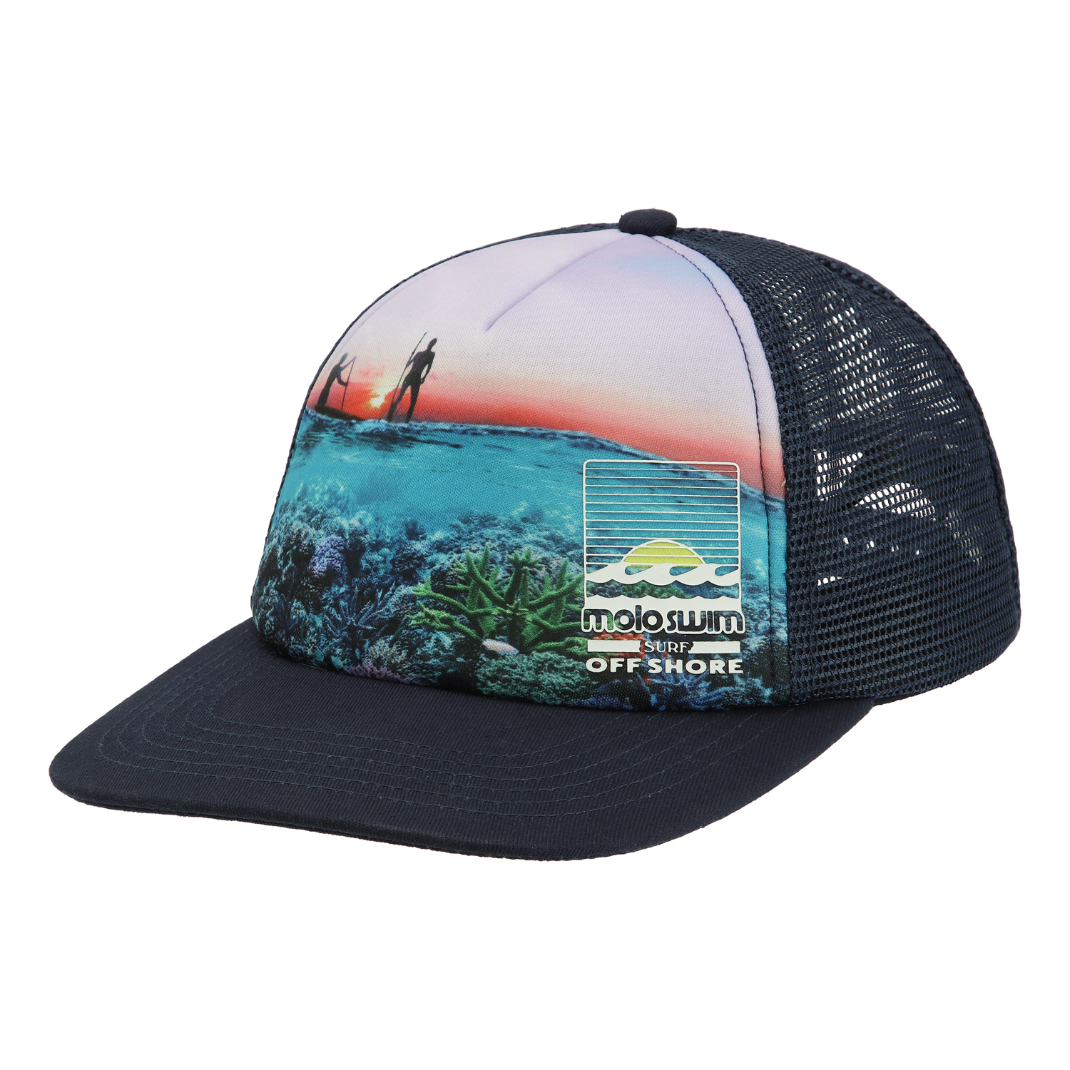 Cooles Cap in Dunkelblau mit einem Aufdruck einiger Leute auf einem Paddleboard. Das Cap hat einen Netzrücken und kann im Nacken verstellt werden.