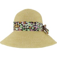 Großer Strohhut mit breiter Krempe und blumigen Bindeband.