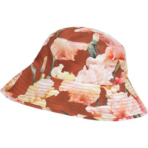 Eimerhut mit breitem Schirm und UV Schutz 50+, der das Kind vor der Sonne schützt. Der Eimerhut ist ein unverzichtbares Sommer-Accessoire und belebt jedes Outfit. Der Sonnenhut ist hier mit Irisblüten in Rottönen.