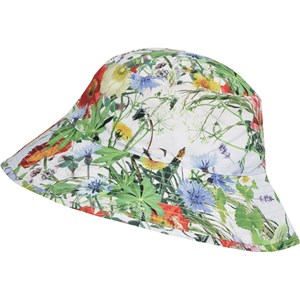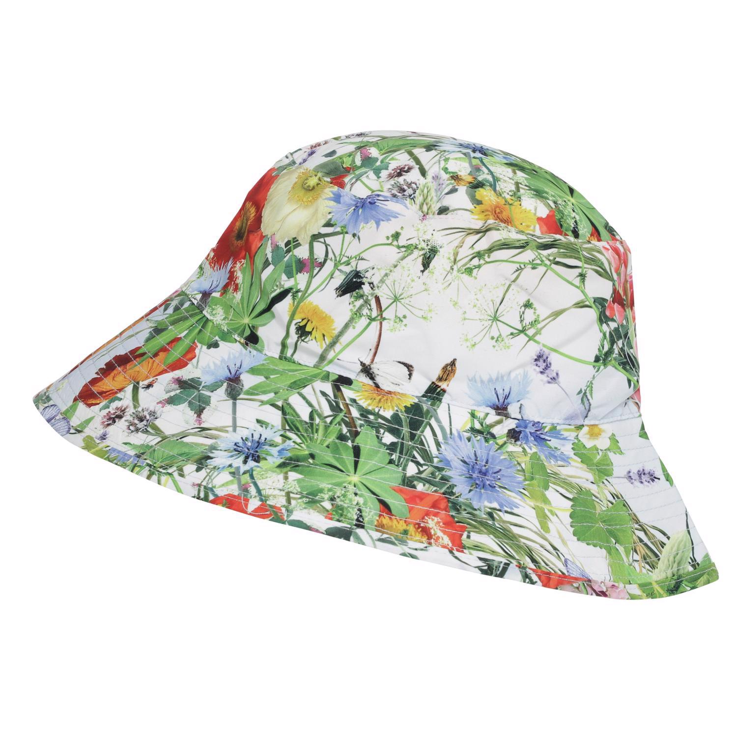 Eimerhut mit breitem Schirm und UV Schutz 50+, der das Kind vor der Sonne schützt. Der Eimerhut ist ein unverzichtbares Sommer-Accessoire und belebt jedes Outfit. Der Sonnenhut ist hier mit Wiesenblumen.