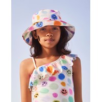 Bullymütze mit breiter Krempe und mehrfarbigem Allover-Print aus 100% Polyester. Der Druck besteht aus pastellfarbenen Punkten, teilweise mit fröhliche Emojis. Der breite Schirm ist perfekt, um zusätzlichen Schutz in der Sonne zu bieten.