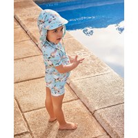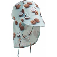 Dehnbarer Sonnenhut für die Kleinen aus recyceltem Polyester mit UV-Schutz 50+. Der Sonnenhut hat eine reguläre Passform, ist am Hinterkopf elastisch und hat einen schmalen Gummizug um den Hals. Er hat einen vorderen Rand mit festem Schaumstoff und einen längeren Rand am Hinterkopf, die beide Schutz vor den Strahlen der Sonne bieten. Der Sonnenhut ist hellblau mit einem Allover-Print von Meeresschildkröten.