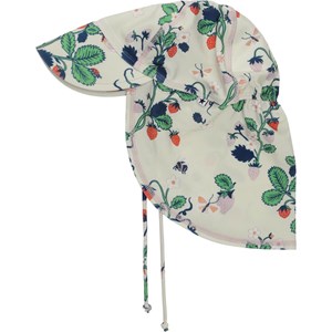 Sonnenhut mit UV Schutz 50+, breitem Schirm und Länge im Nacken, der das Kind bestens schützt. Der Sonnenhut hat einen feinen Print aus gezeichneten Erdbeerblüten.