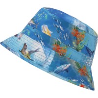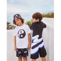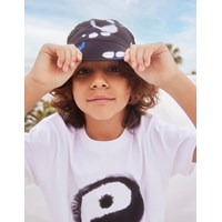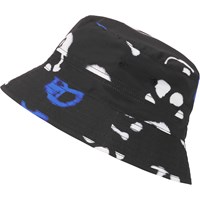 Schwarzer Bullymütze mit Allover-Print aus 100% Polyester. Der Druck besteht aus mit Wasserfarben bemalten Emojis und Friedenszeichen in Blau und Weiß. Die Mütze ist perfekt, um zusätzlichen Schutz in der Sonne zu bieten.