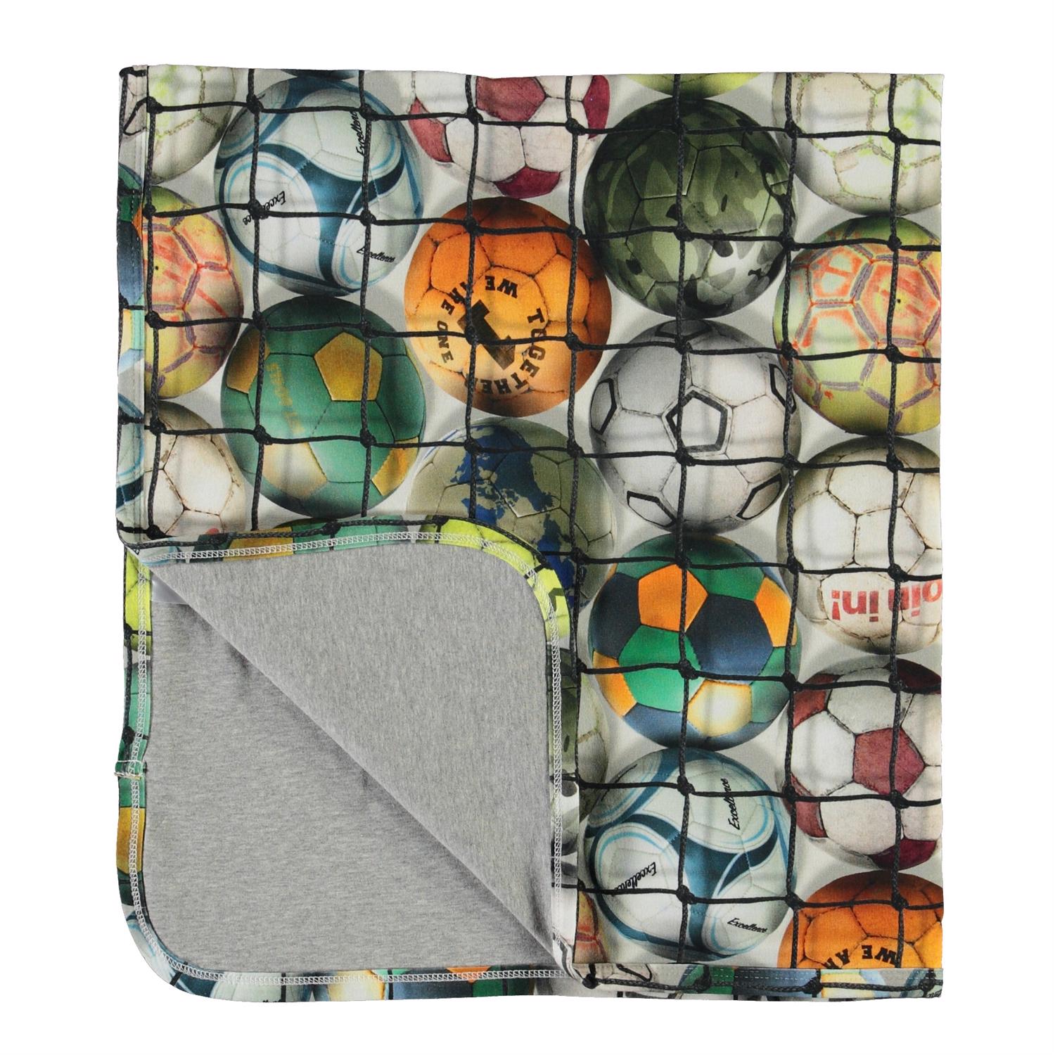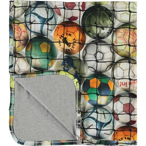 Weiche, doppelteschichte Baumwolldecke mit Druck von Fußbällen hinter einem Netz. Die Decke hat eine graue Rückseite. Ecocert Greenlife, certifikationsnr. 197496.