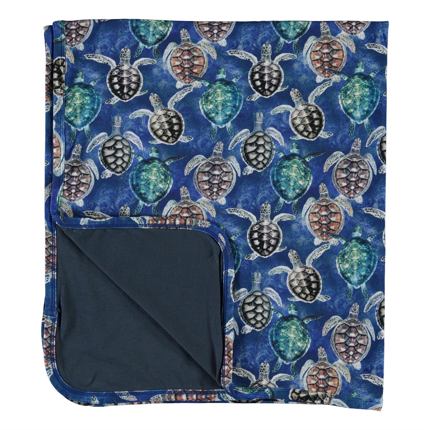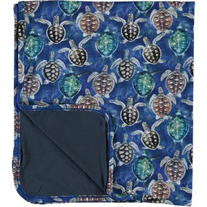 Weiche, doppelteschichtige Baumwolldecke in Blau mit Druck von Schildkröten. Ecocert Greenlife, certifikationsnr. 197496.