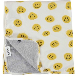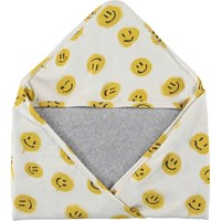 Jetzt ist eine doppellagige Baumwolldecke mit Kapuze, die als Handtuch, Wickel und Decke fungieren kann. Es hat Aufdrucke von aufgesprühten gelben Smileys auf einem cremefarbenen Hintergrund. Das Tuch ist eng gewebt und dennoch unglaublich weich und leicht, sodass es sich perfekt zum Einwickeln Ihres Babys eignet. Das Tuch hat eine graue Rückseite.