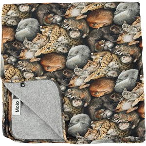 Weiche, doppellagige Baumwolldecke mit Aufdruck verschiedener Tiere, die in den Winterschlaf gegangen sind und tief und fest schlafen. Die Decke hat eine graue Rückseite.