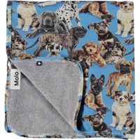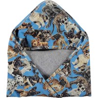 Jetzt ist eine doppellagige Baumwolldecke mit Kapuze, die als Handtuch, Wickel und Decke fungieren kann. Es hat Drucke von süßen Welpen auf blauem Hintergrund. Das Tuch ist eng gewebt und dennoch unglaublich weich und leicht, sodass es sich perfekt zum Einwickeln Ihres Babys eignet. Das Tuch hat eine graue Rückseite.