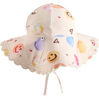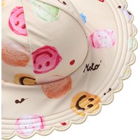 Dehnbarer, cremefarbener Sonnenhut mit Eiscreme-Print für die Kleinen. Der Sonnenhut besteht aus recyceltem Polyester mit UV-Schutz 50+, hat eine normale Passform, ein schmales elastisches Band unter dem Kinn und eine breite Krempe, die vor den Sonnenstrahlen schützt.