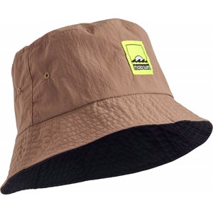 Wendbarer beiger und schwarzer Eimerhut aus recyceltem Nylon. Der Hut hat eine reguläre Passform mit Luftlöchern und ist in drei verschiedenen Größen erhältlich. Das Material ist leicht und trocknet schnell.