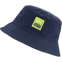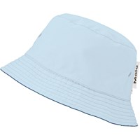 Blauer 2-in-1-Bullymütze aus Nylon mit neongelbem Molo Swim-Label auf der Vorderseite. Die Bullymütze ist wendbar und kann daher sowohl dunkelblau als auch hellblau sein.