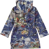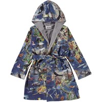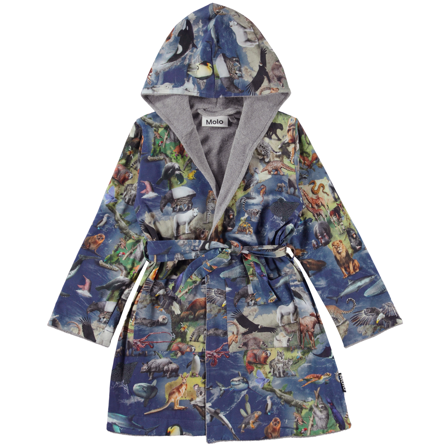 Wave ist ein weicher Bademantel im Allover-Print Animal Earth, der die Kontinente unseres Planeten und alle Tiere zeigt, die sowohl im Wasser als auch an Land leben. Der Bademantel ist mit einem leichten und dicht gewebten, weichen Frottee in Grau gefüttert, hat zwei Taschen, Bänder an der Taille und eine große Kapuze, um Hals und Kopf extra warm zu halten.