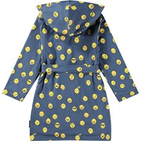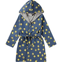 Dunkelblaue Morgenmantel aus ökologischem Baumwollfrottee mit einem Emoji-Print. Der Morgenmantel hat ein graues Innenfutter, zwei Taschen, einen Taillengürtel und eine Kapuze.