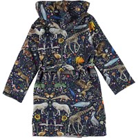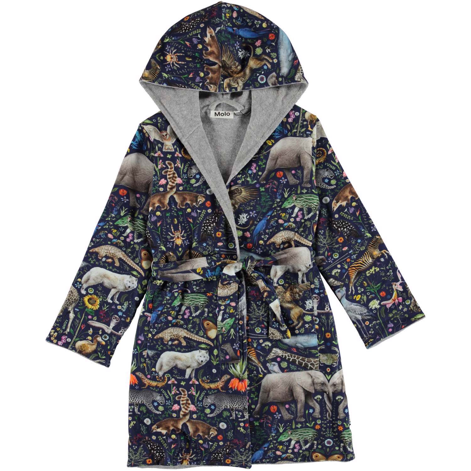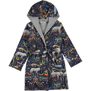 Weicher Öko-Bademantel mit Aufdruck von bunten und lustigen surrealen Tieren auf dunkelblauem Hintergrund. Der Bademantel ist mit einem leichten und dicht gewebten Softfrottee gefüttert, hat zwei Taschen, ein Bindeband in der Taille und eine große Kapuze, die Hals und Kopf extra warm hält.