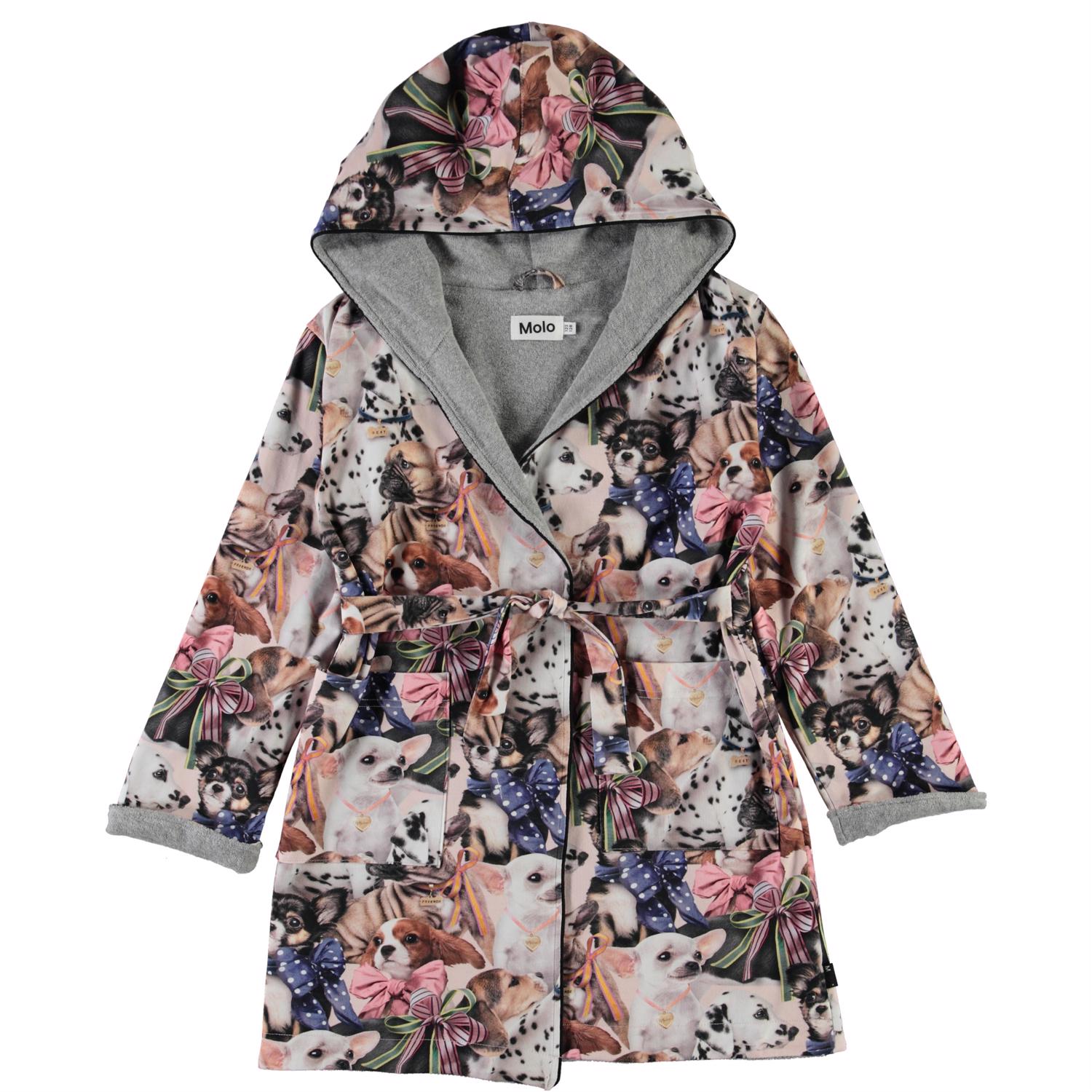 Weicher Bademantel mit Druck von kleinen Hunden mit Schleifen um den Hals. Der Bademantel ist mit einem dünnen und weichen Frottee gefüttert, hat zwei Taschen, Bindeband an der Taille sowie eine große Kaputze um den Hals und den Kopf extra warm zu halten. Ecocert Greenlife, certifikationsnr. 197496.