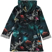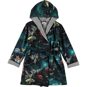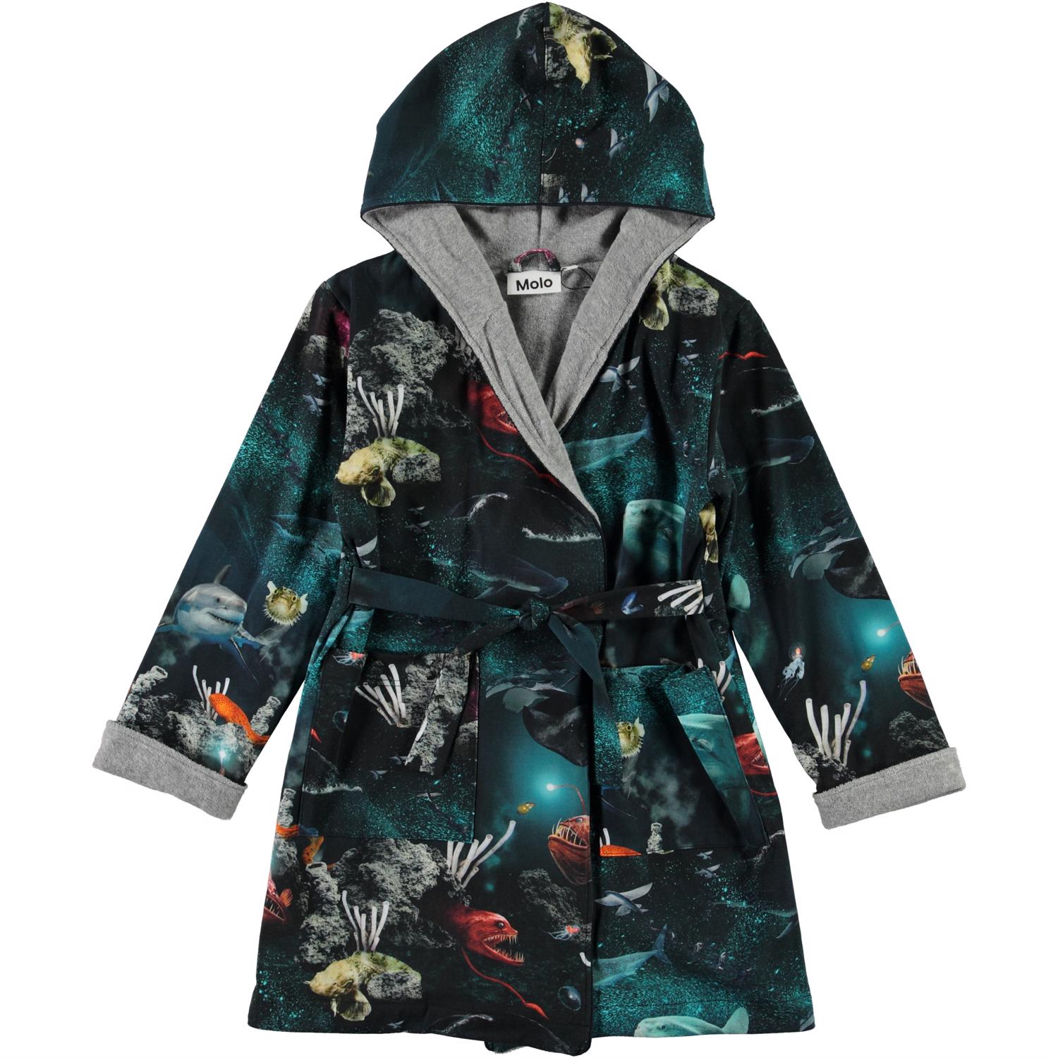 Weicher Bademantel mit Aufdruck von Fischen unter der Meeresoberfläche. Der Bademantel ist mit einem dünnen und weichen Frottee gefüttert, hat zwei Taschen, eine Bindeband in der Taille und eine große Kapuze, um Hals und Kopf besonders warm zu halten.