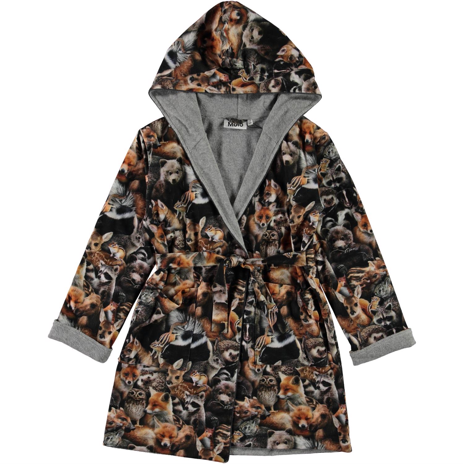 Weicher Bademantel mit Aufdruck der Waldtiere. Der Bademantel ist mit einem dünnen und weichen Frottee gefüttert, hat zwei Taschen, eine Bindeband in der Taille und eine große Kapuze, um Hals und Kopf besonders warm zu halten.