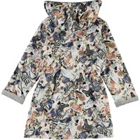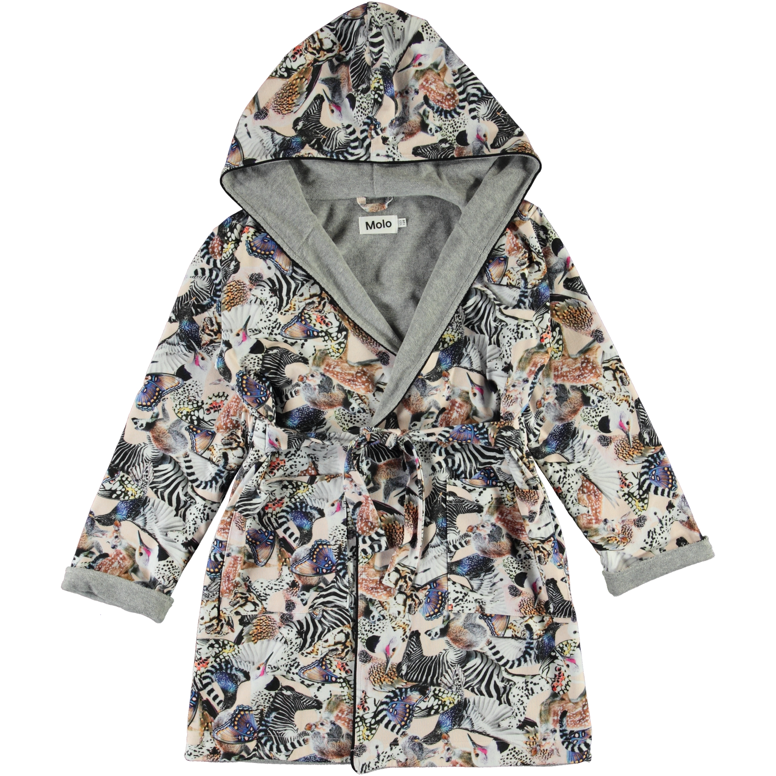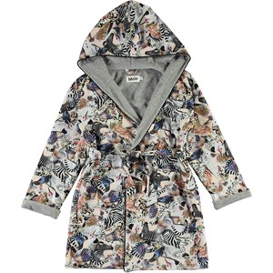 Weicher Bademantel mit Druck verschiedener Tiere, die zusammen ein schönes Muster bilden. Der Bademantel ist mit dünnen und weichen Frottee gefüttert, hat zwei Taschen, einen Bindeband in der Taille und eine große Kaputze, um den Nacken und Kopf besonders warm zu halten.