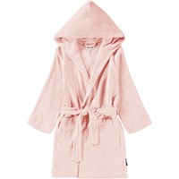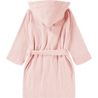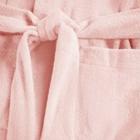Rosafarbener Bademantel aus superweichem, Ökologischem Baumwoll-Frottee. Der Bademantel hat zwei Taschen, einen Gürtel in der Taille und eine Kapuze.