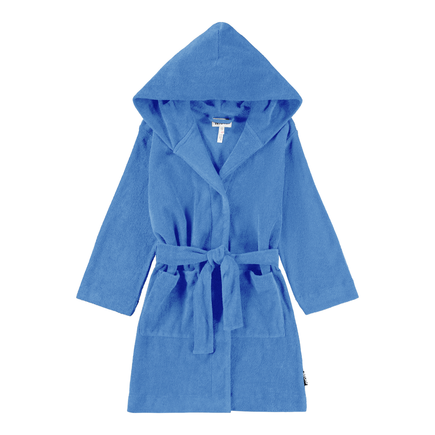 Dunkelblauer Bademantel aus superweichem, Ökologischem Baumwoll-Frottee. Der Bademantel hat zwei Taschen, einen Gürtel in der Taille und eine Kapuze.