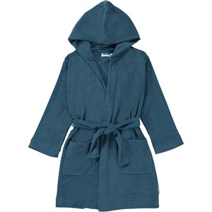 Wyn ist ein herrlich weicher Bademantel aus leichtem und dicht gewebtem petrolblauem Frottee. Der Mantel hat zwei Taschen, Bänder in der Taille und eine große Kapuze, um Hals und Kopf besonders warm zu halten.