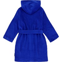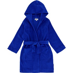 Blauer Bademantel aus superweichem Öko-Baumwollfrottee. Der Bademantel hat zwei Taschen, Bänder in der Taille und eine Kapuze.