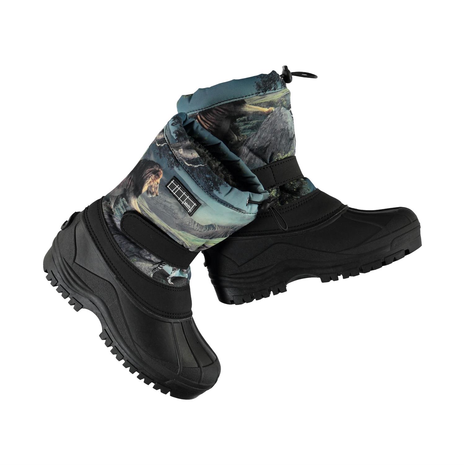 Funktioneller Winterstiefel aus Polyester mit verstellbarem Schaftverschluss und weicher Gummisohle, die sich hoch um den Fuß herum fortsetzt. Der Stiefel ist mit Druck von Tieren aus der Zukunft. Sowohl die Sohle als auch der Schaft sind separat wasserdicht. Der Stiefel hat eine innere, herausnehmbare, robuste Polyestersocke, die den Stiefel sowohl für kältere als auch für wärmere Perioden geeignet macht. Dieses Produkt hat eine wasserbeständige PFC-freie Imprägnierung (enthält z.B. kein PFOS, PFOA und dergleichen). Wassersäulendruck: 10.000 mm. Atmungsaktivität: 8.000 g/m2/24h