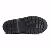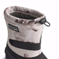 Praktische Winterstiefel mit einer robusten und rutschfesten schwarzen Sohle und einem Druck süßer Hasen unter Schneeglöckchen auf grauem Hintergrund. Die Stiefel haben ein verstellbares Gummiband am oberen Schaft, verstellbares Klettband um den Knöchel, eine innere Socke und eine gute Höhe, sodass sie für alle Arten von Wetter geeignet sind.