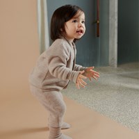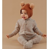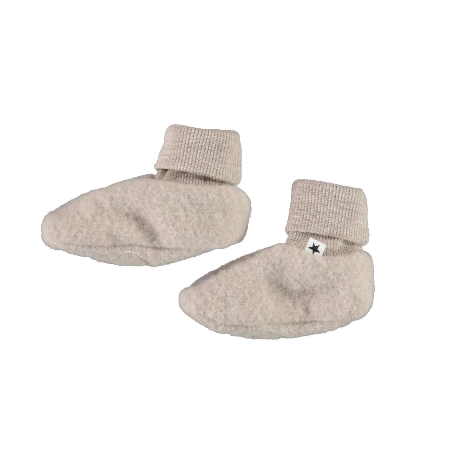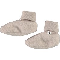 Beige Babyschuhe aus Wolle, der an den kleinsten Füßen wärmt. Dieses Produkt ist Öko-Tex zertifiziert.