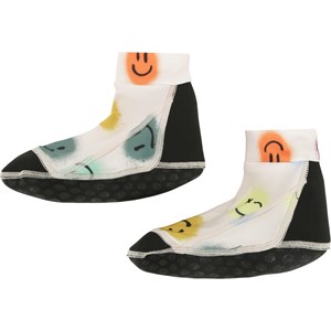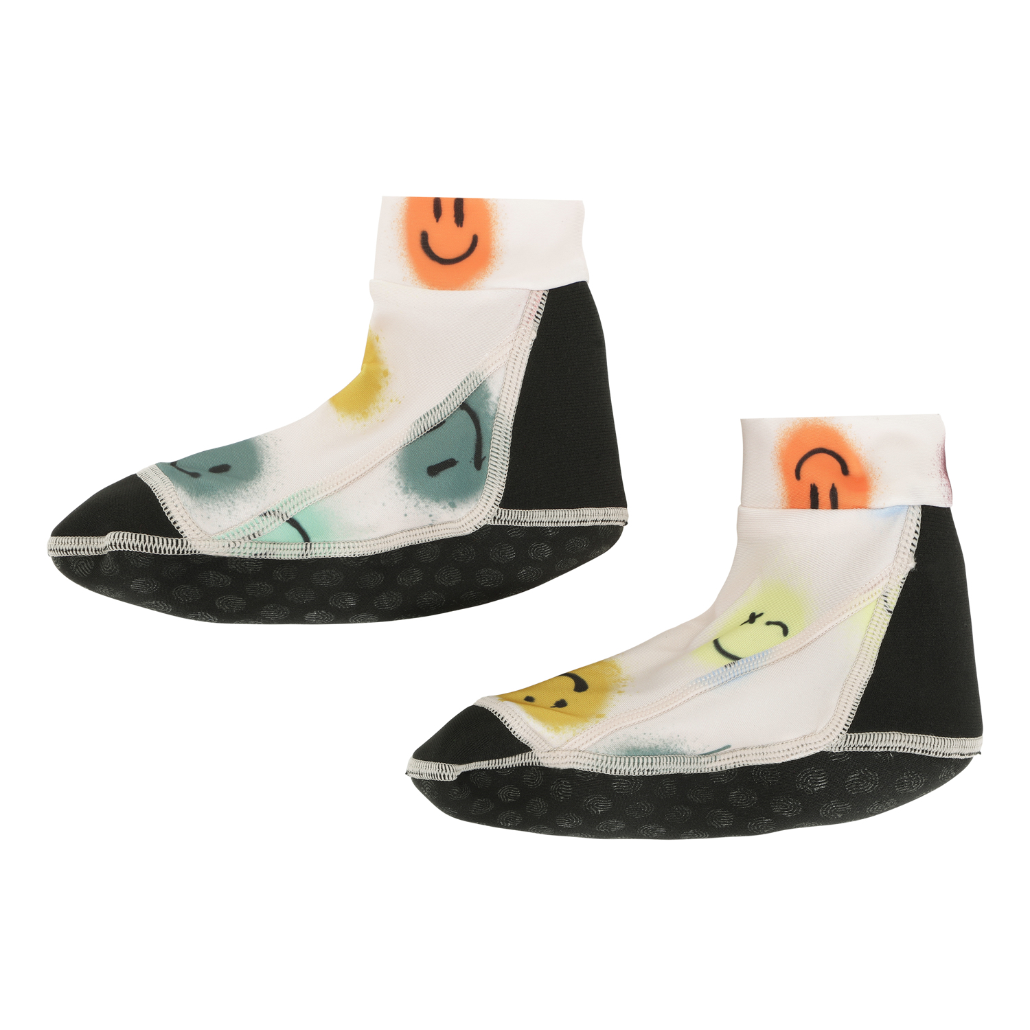 Neopren-Badesocken, die kleine Füße vor scharfen Gegenständen und heißem Sand schützen. Diese Badesocken sind in Rosa mit verschiedenfarbigen Smileys.