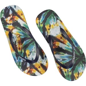 Unverzichtbare Flip Flops für den langen Sommer, mit dunklen Riemen. Die Sandalen haben einen coolen Batikdruck.