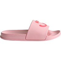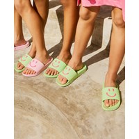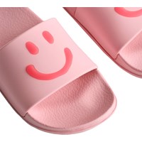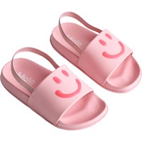 Rosa Badeschlappen mit einem Smiley-Gesicht, breitem Fußriemen und geformtem Fußbett. Wasserabweisend und ideal für Pool und Strand. Die Größen 23/24 und 25/26 haben einen Fersenriemen, der für einen stabilen Sitz bei den Kleinen sorgt.