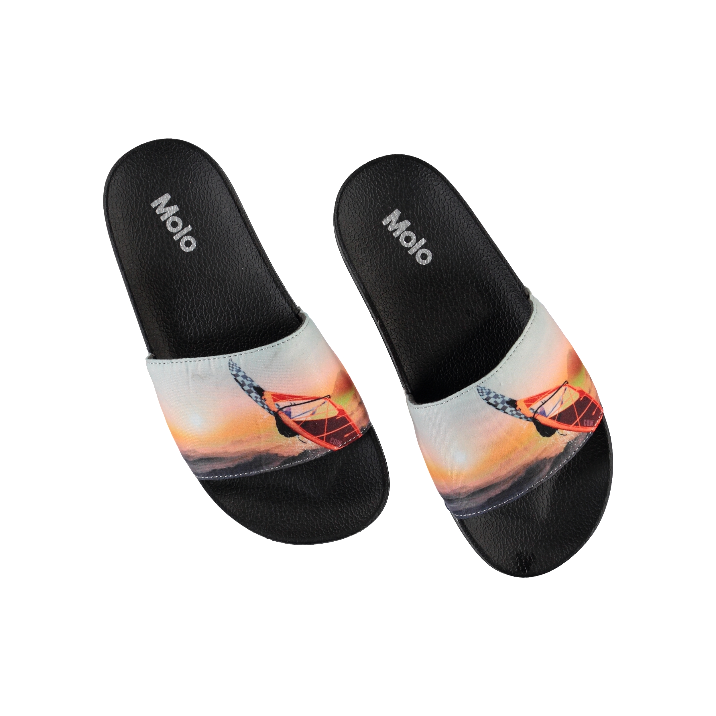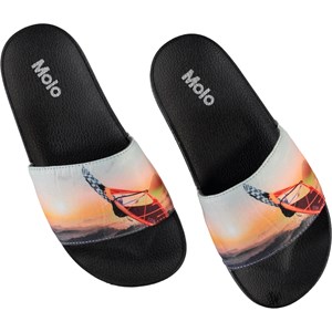Molos Zhappy Sandalen sind ein Muss in der Sommerhitze. Diese Slippers sind in Schwarz mit Aufdruck eines Windsurfers bei Sonnenuntergang.