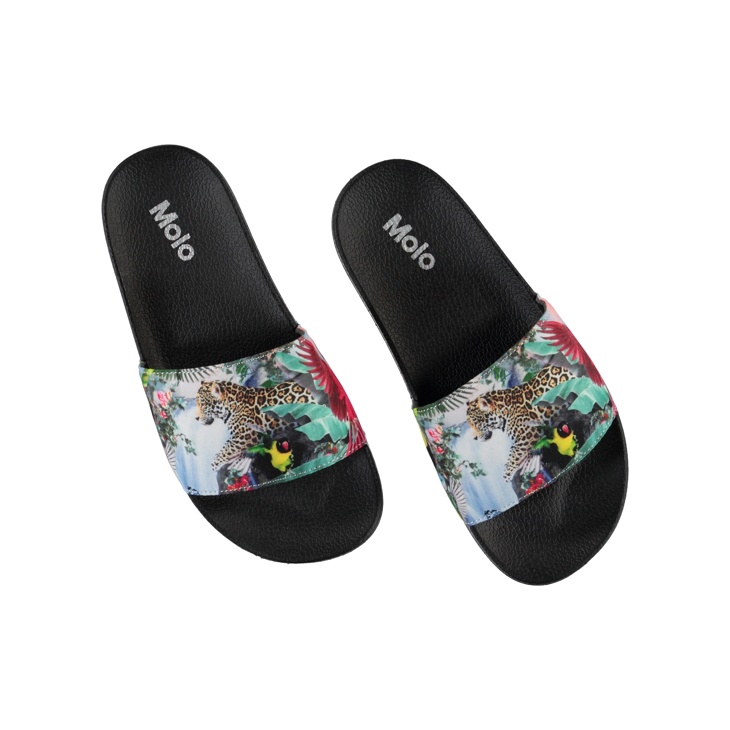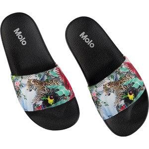 Molos Zhappy-Sandalen sind ein Muss in der Sommerhitze. Diese Slippers sind schwarz und haben einen Druck von Leoparden und anderen wilden Tieren.