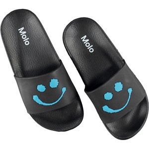 Schwarze Badesandalen mit fröhlichen blauen Emojis auf der Vorderseite. Die Sandalen sind wasserabweisend und eignen sich daher perfekt zum Mitnehmen ins Schwimmbad oder an den Strand.